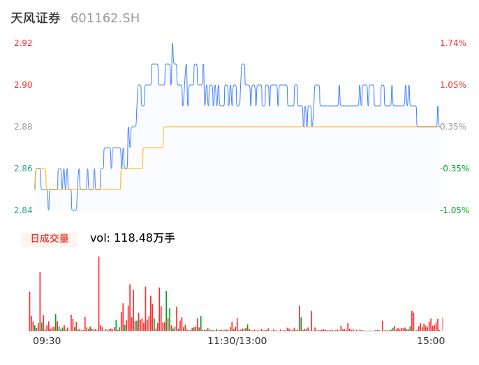 04月18日,天风证券收报2.88,股价涨幅0.35%,成交金额3.42亿元,换手率1.37%。