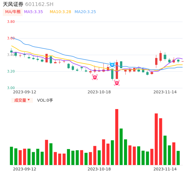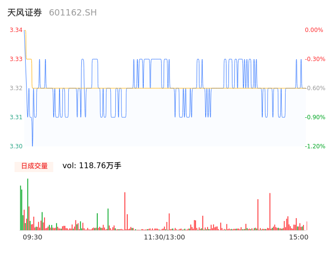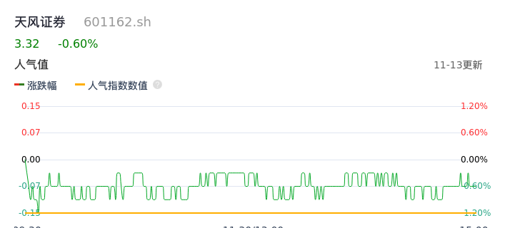 11月13日,天风证券收报3.32,股价涨幅-0.60%,成交金额3.94亿元,换手率1.37%。