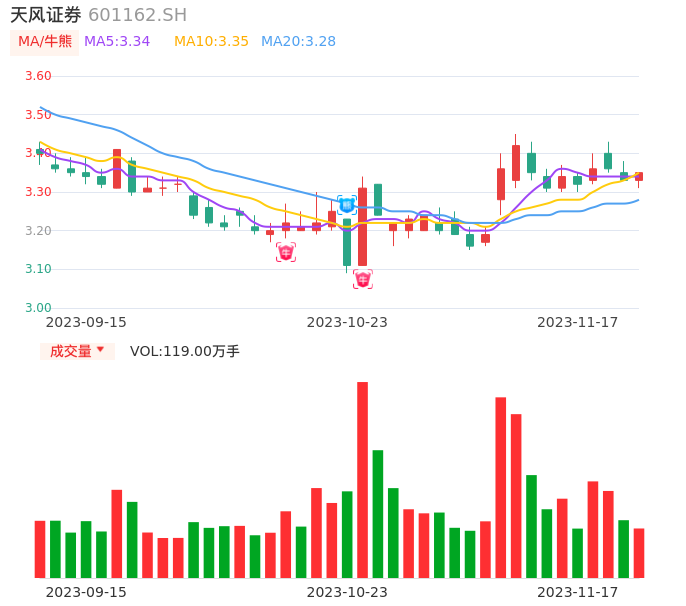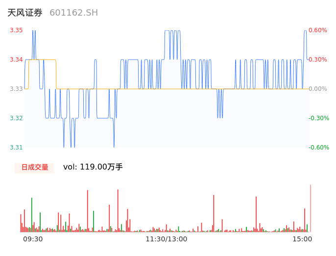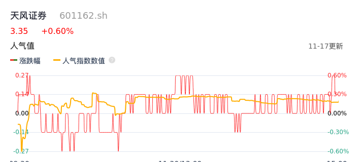 11月17日,天风证券收报3.35,股价涨幅0.60%,成交金额3.97亿元,换手率1.37%。