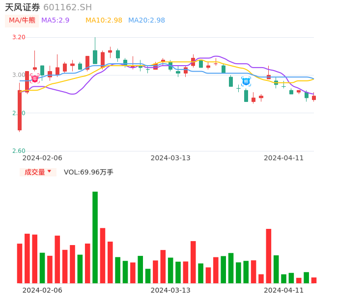 天风证券在3月27日出现日线级别熊点,且60分钟级别也处于熊点区间,股价处于偏弱行情,注意下方箱型支撑位:2.70元,如果被有效跌穿将进入快速下降通道。