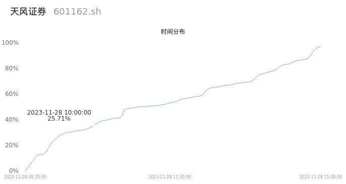 601162天风证券2023年11月28日成交86.44万手,成交金额2.77亿元,相较昨日缩量30.43万手,换手率1.00%,成交清淡。