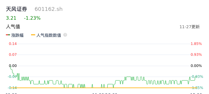 11月27日,天风证券收报3.21,股价涨幅-1.23%,成交金额3.75亿元,换手率1.35%。