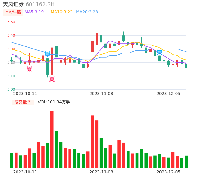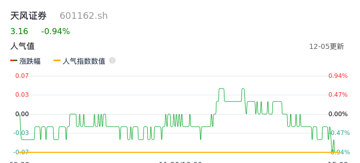 12月05日,天风证券收报3.16,股价涨幅-0.94%,成交金额3.23亿元,换手率1.17%。