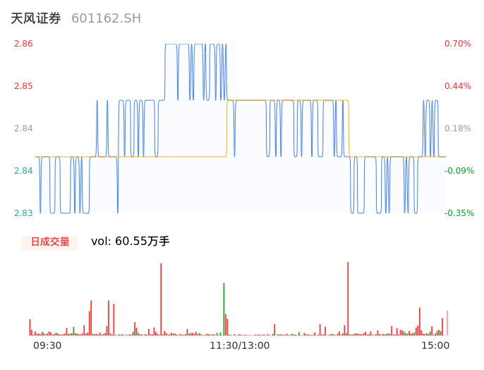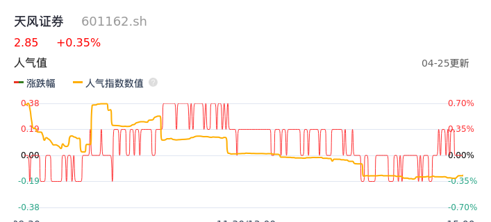 04月25日,天风证券收报2.85,股价涨幅0.35%,成交金额1.72亿元,换手率0.70%。