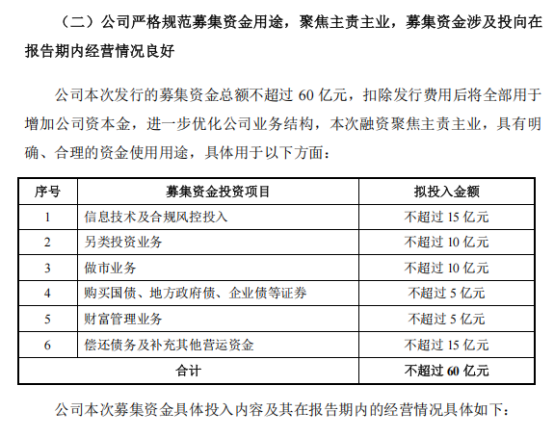 1)本次发行募集资金总额不超过60亿元,扣除发行费用后将全部用于增加公司资本金,具体用于信息技术及合规风控投入,另类投资业务,做市业务,购买国债、地方政府债、企业债等证券,财富管理业务,偿还债务及补充其他营运资金等。
