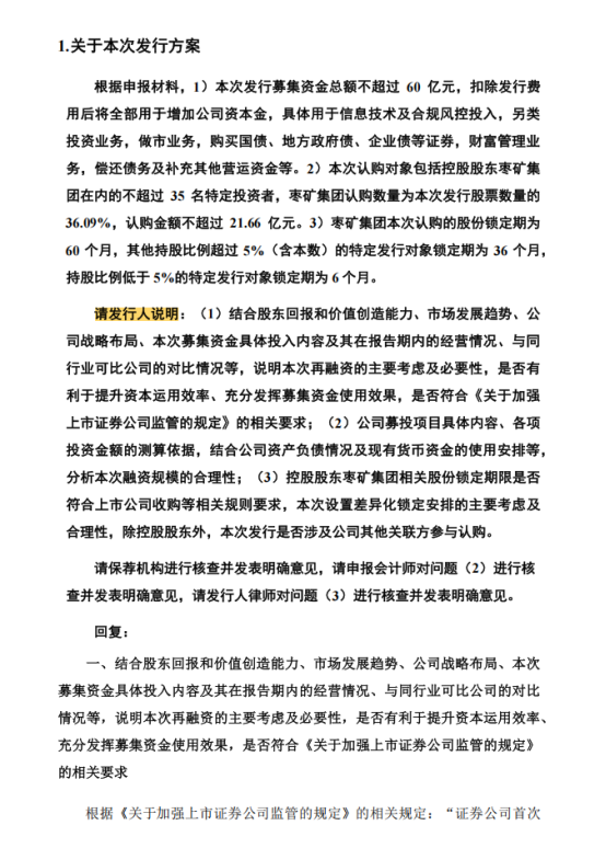 券商再融资事项备受市场关注。7月15日,中泰证券最新披露了公司定增事项监管审核问询函的回复,涉及七个大方面。同时也更新了最新版本的定增方案,这集中在两个公告内。