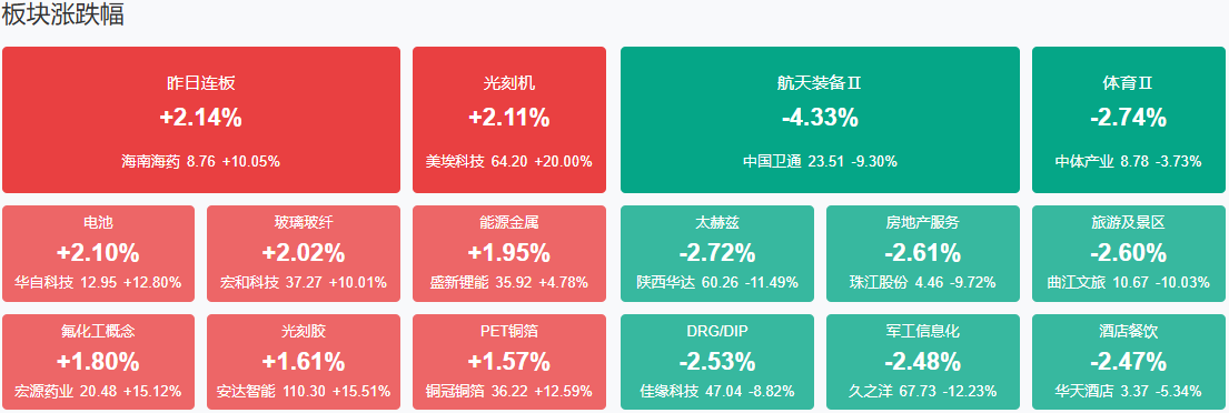 板块方面,光刻机、电池、海南自贸区等板块涨幅居前,旅游及酒店、商业航天等板块跌幅居前。截至收盘,沪指涨0.07%,深成指0.27%,创业板指0.41%。