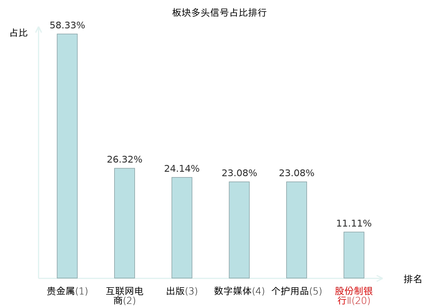 全市场所有行业板块中主力多头信号占比排名中,贵金属板块位居第一。贵金属板块名次提升最快,较昨日上升108位。