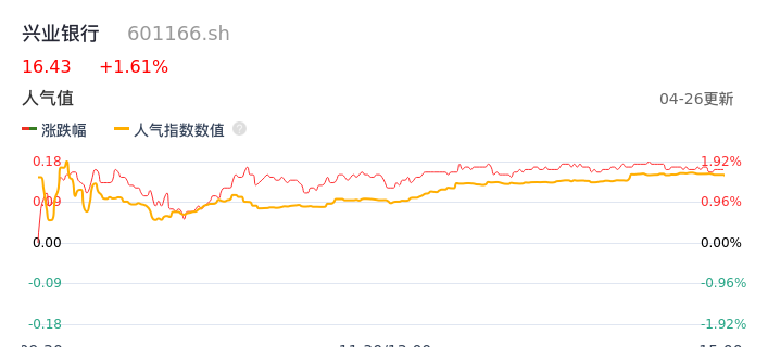 04月26日,兴业银行收报16.43,股价涨幅1.61%,成交金额20.81亿元,换手率0.61%。