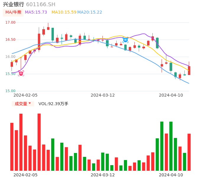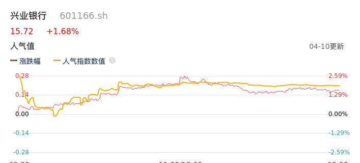 04月10日,兴业银行收报15.72,股价涨幅1.68%,成交金额14.50亿元,换手率0.44%。