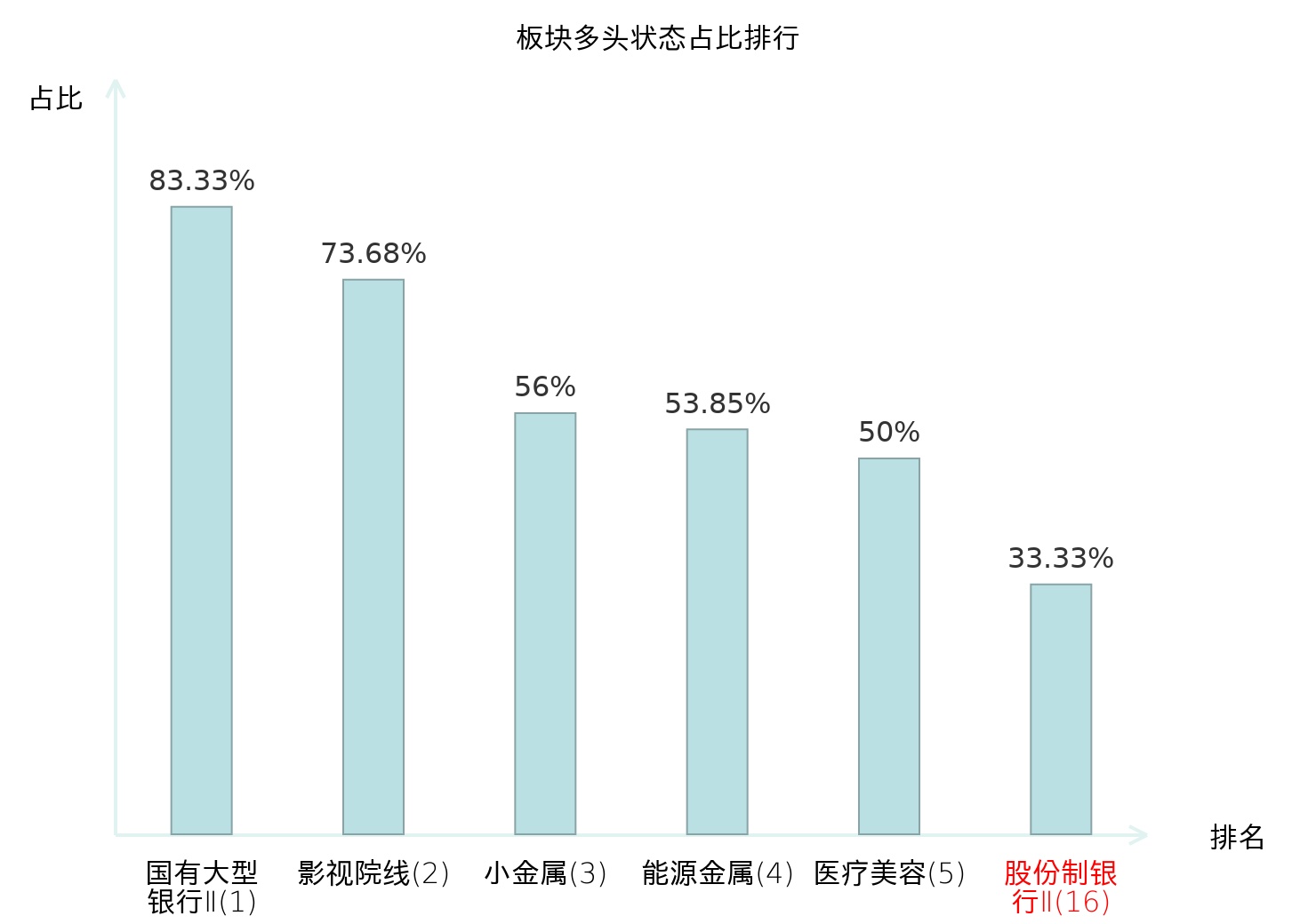 全市场所有行业板块中主力多头状态占比排名中,国有大型银行Ⅱ板块位居第一。电视广播Ⅱ板块名次提升最快,较昨日上升99位。