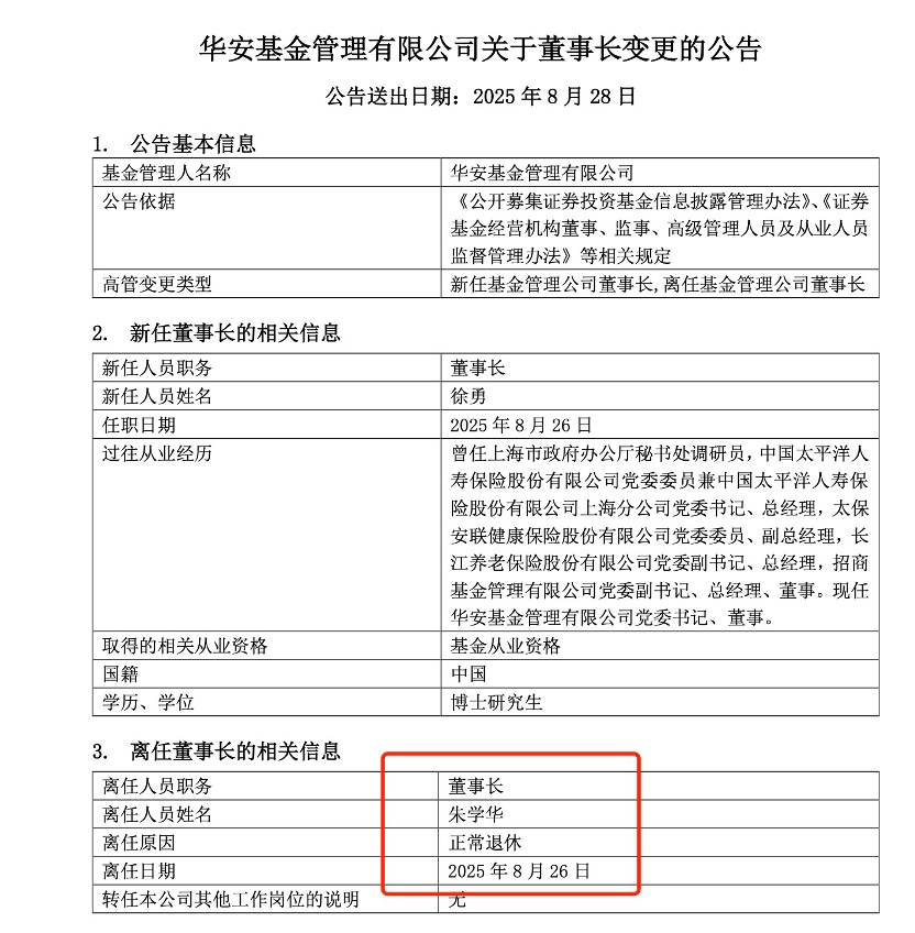 8月28日,华安基金也公布了原董事长朱学华退休的消息,华安基金公司称,朱学华正常退休,8月26日正式离任,公司朱学华在担任董事长期间为本公司作出的重大贡献给予高度评价并致以衷心感谢。