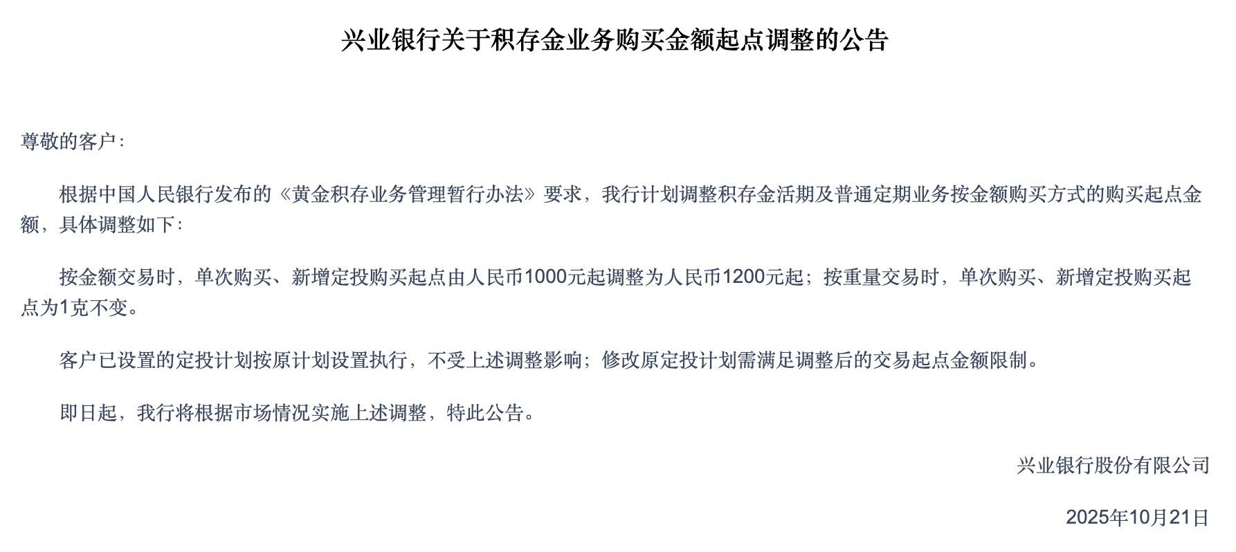 上证报中国证券网讯近日,兴业银行公告称,根据中国人民银行发布的《黄金积存业务管理暂行办法》要求,该行计划自10月21日起调整积存金活期及普通定期业务按金额购买方式的购买起点金额。