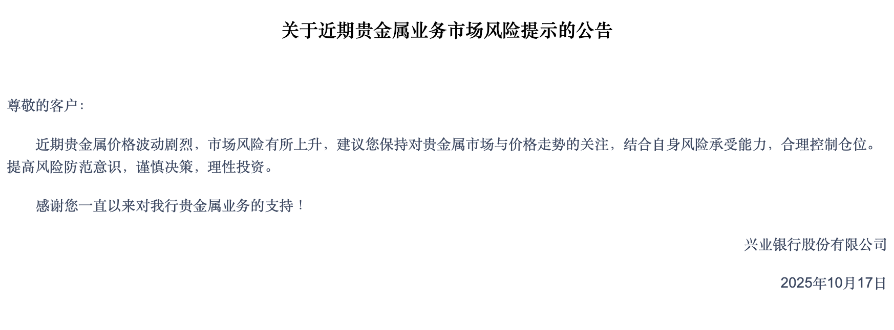 兴业银行此前已于10月17日发布风险提示:近期贵金属价格波动剧烈,市场风险有所上升,建议客户保持对贵金属市场与价格走势的关注,结合自身风险承受能力,合理控制仓位。提高风险防范意识,谨慎决策,理性投资。