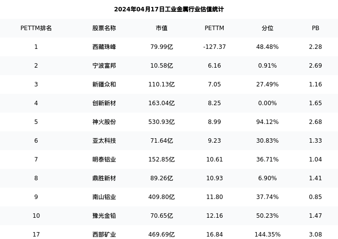 从估值角度看:西部矿业最新市盈率PETTM为16.84,在行业内排名16/59,处于144.35分位。