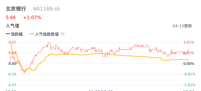 04月15日,北京银行收报5.66,股价涨幅1.07%,成交金额4.90亿元,换手率0.41%。