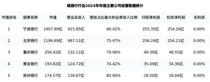 北京银行最新报告期数据为年报,下表汇总了城商行行业内市值靠前的公司年报主要经营数据