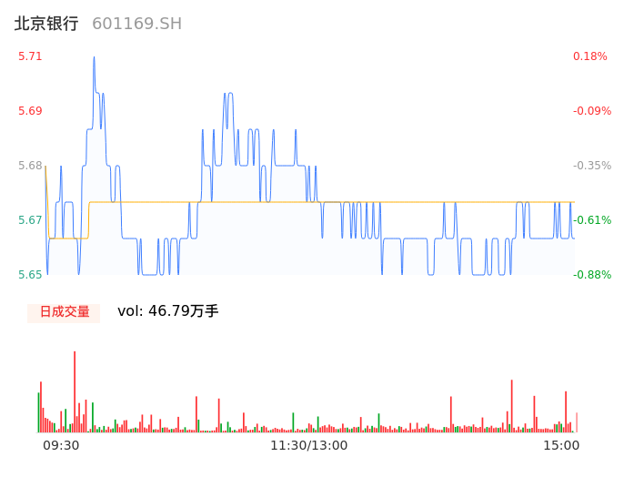 04月11日,北京银行收报5.66,股价涨幅-0.70%,成交金额2.65亿元,换手率0.22%。