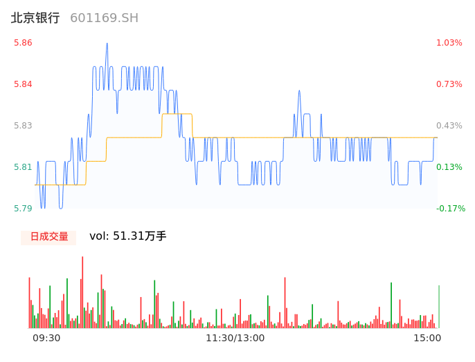 04月19日,北京银行收报5.80,股价涨幅0.00%,成交金额2.99亿元,换手率0.24%。