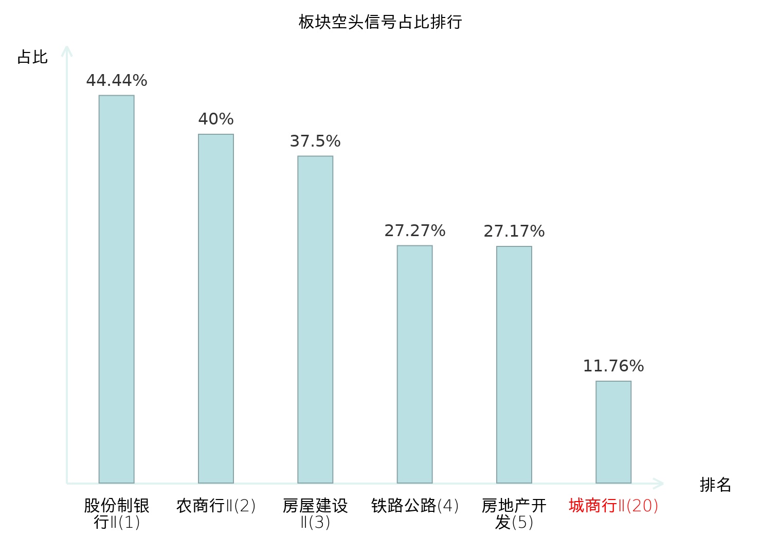 全市场所有行业板块中主力空头信号占比排名中,股份制银行Ⅱ板块位居第一。化学原料板块名次提升最快,较昨日上升118位。