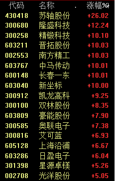 汽车零部件板块大涨,苏轴股份涨超26%,隆盛科技涨超12%。