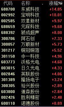 今天上午,新能源赛道逆市走强,PET铜箔表现最强,东威科技涨超14%,宝明科技等个股涨停。
