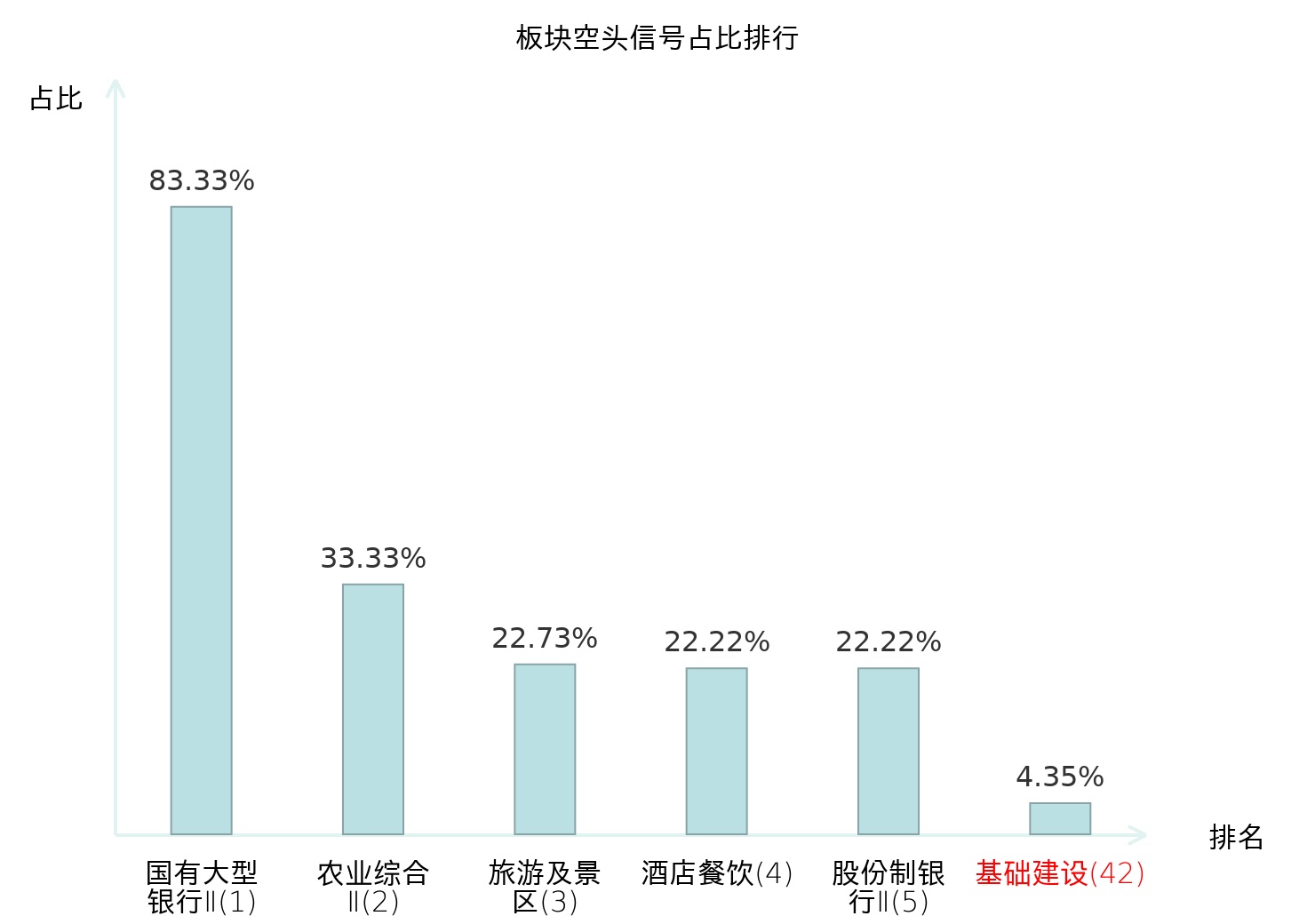 全市场所有行业板块中主力空头信号占比排名中,国有大型银行Ⅱ板块位居第一。饮料乳品板块名次提升最快,较昨日上升104位。