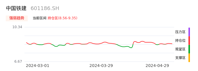 我们来看一下该股的九方特色指标强弱趋势的情况:中国铁建自04月24日从观望区上穿到持仓区。股价近期在多头区域回调整理。后续重点关注多空分界点的争夺:8.56元。如未能有效站稳则可能重新回到空头行情。