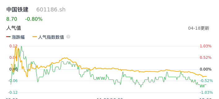 04月18日,中国铁建收报8.70,股价涨幅-0.80%,成交金额9.12亿元,换手率0.90%。