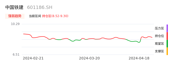我们来看一下该股的九方特色指标强弱趋势的情况:中国铁建自04月15日从观望区上穿到持仓区。股价近期在多头区域回调整理。后续重点关注多空分界点的争夺:8.52元。如未能有效站稳则可能重新回到空头行情。
