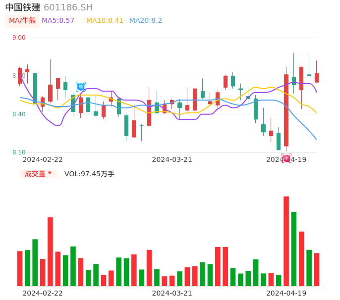 04月19日,中国铁建收报8.72,股价涨幅0.23%,成交金额8.52亿元,换手率0.85%。