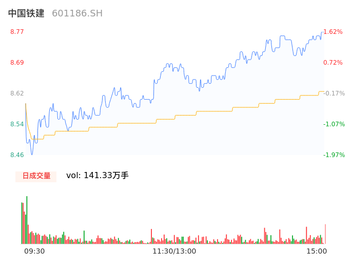 04月17日,中国铁建收报8.77,股价涨幅1.62%,成交金额12.18亿元,换手率1.23%。