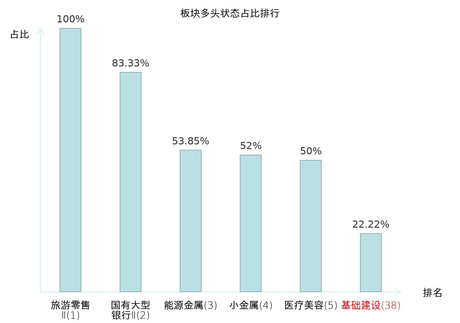 全市场所有行业板块中主力多头状态占比排名中,旅游零售Ⅱ板块位居第一。旅游零售Ⅱ板块名次提升最快,较昨日上升130位。