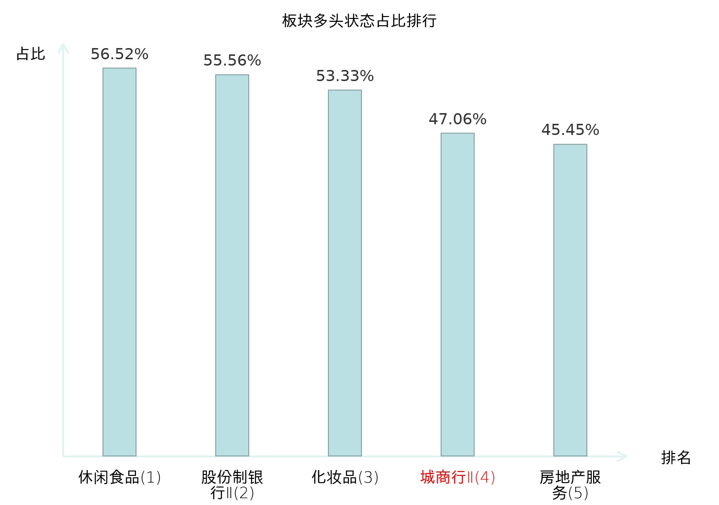 全市场所有行业板块中主力多头状态占比排名中,休闲食品板块位居第一。汽车服务板块名次提升最快,较昨日上升90位。
