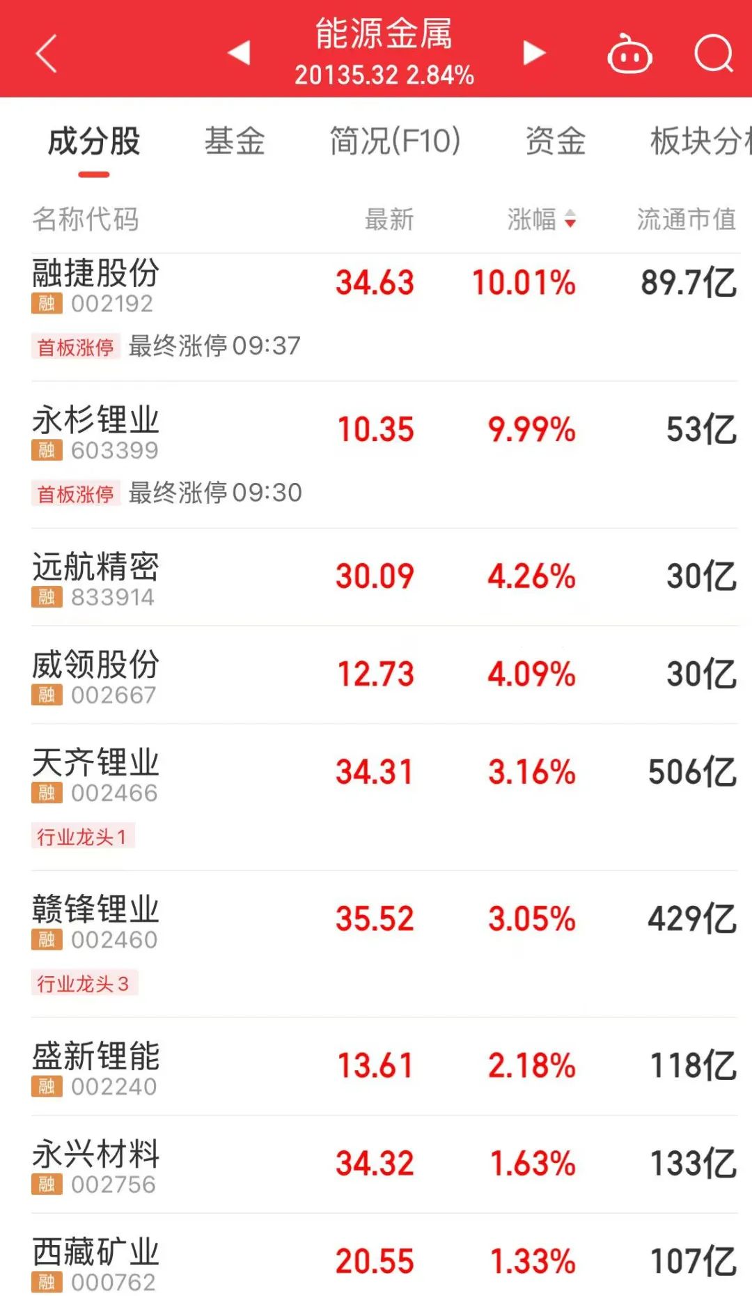 今天上午,有色金属概念表现活跃。能源金属板块领涨,融捷股份、永杉锂业等个股涨停。工业金属、贵金属等板块跟涨。