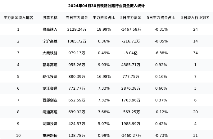 从主力资金流向来看,铁路公路行业今日主力资金流入27.03亿元,在所有申万二级行业中排名:14/131。