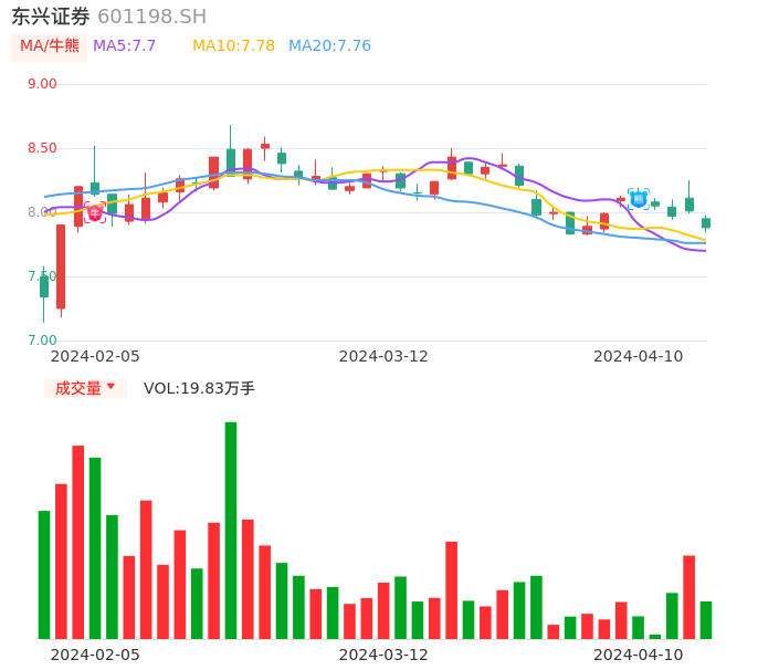 04月10日,东兴证券收报7.88,股价涨幅-1.62%,成交金额1.57亿元,换手率0.61%。