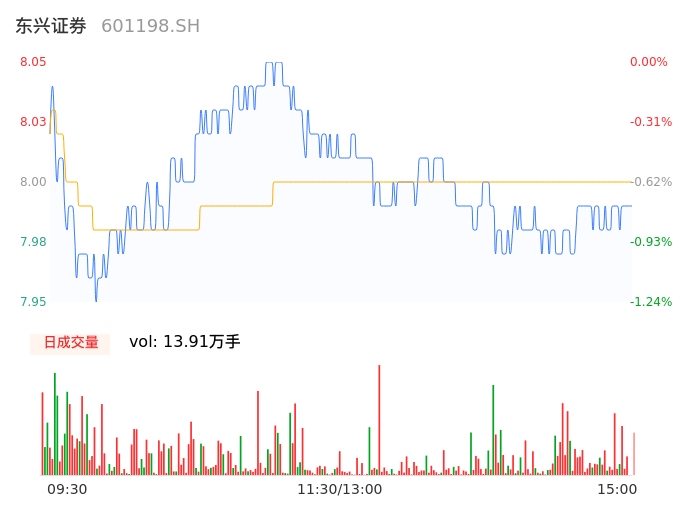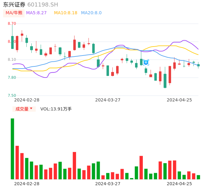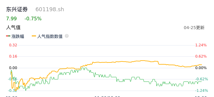 04月25日,东兴证券收报7.99,股价涨幅-0.75%,成交金额1.11亿元,换手率0.43%。