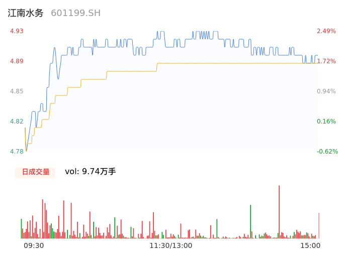 04月11日,江南水务收报4.90,股价涨幅1.87%,成交金额4765.60万元,换手率1.04%。