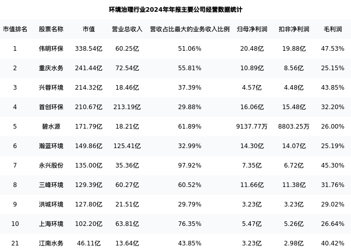 江南水务最新报告期数据为年报,下表汇总了环境治理行业内市值靠前的公司年报主要经营数据