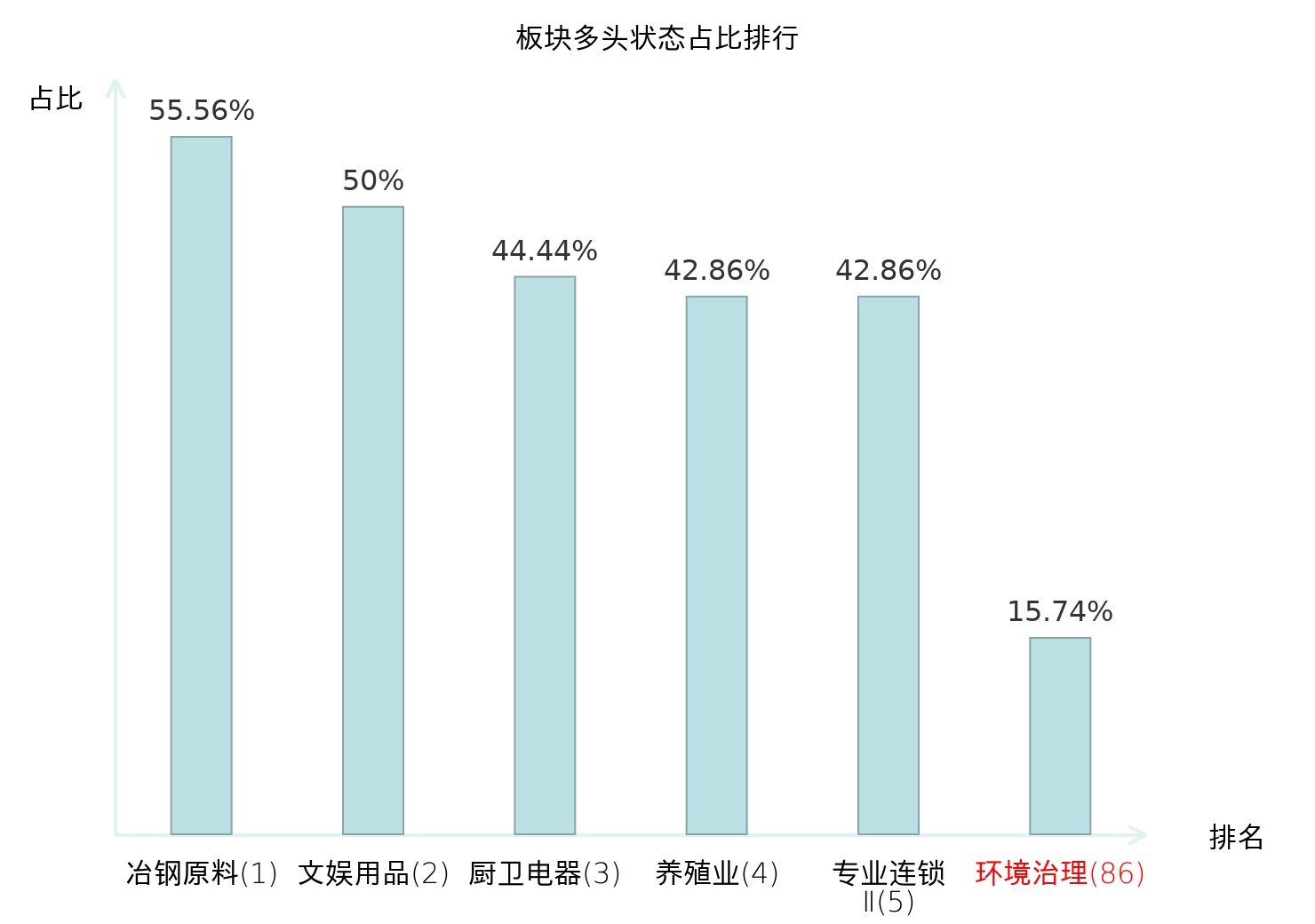 全市场所有行业板块中主力多头状态占比排名中,冶钢原料板块位居第一。能源金属板块名次提升最快,较昨日上升48位。