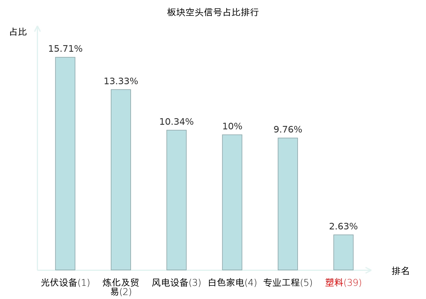 全市场所有行业板块中主力空头信号占比排名中,光伏设备板块位居第一。光伏设备板块名次提升最快,较昨日上升125位。