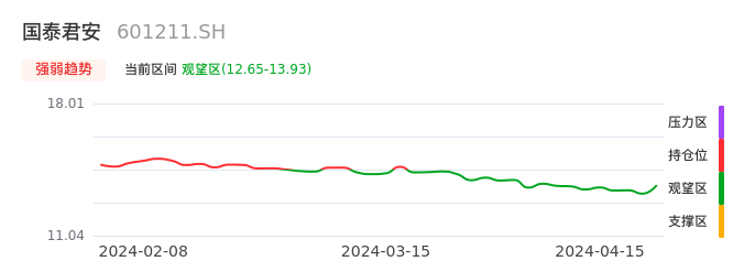 我们来看一下该股的九方特色指标强弱趋势的情况:国泰君安自03月19日从持仓区下穿到观望区。股价近期持续下跌后,短期出现止跌迹象。后续重点关注能否再次站上多空分界点:13.93元。如未能有效突破则可能进入新一轮空头行情。