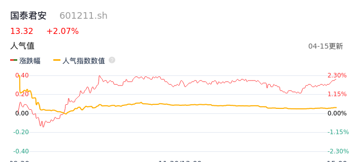 04月15日,国泰君安收报13.32,股价涨幅2.07%,成交金额5.02亿元,换手率0.51%。