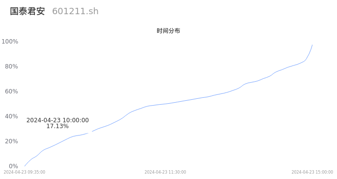 601211国泰君安2024年04月23日成交20.11万手,成交金额2.69亿元,相较昨日缩量2.61万手,换手率0.27%,成交清淡。