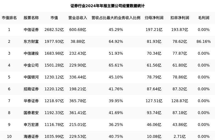 国泰君安最新报告期数据为年报,下表汇总了证券行业内市值靠前的公司年报主要经营数据