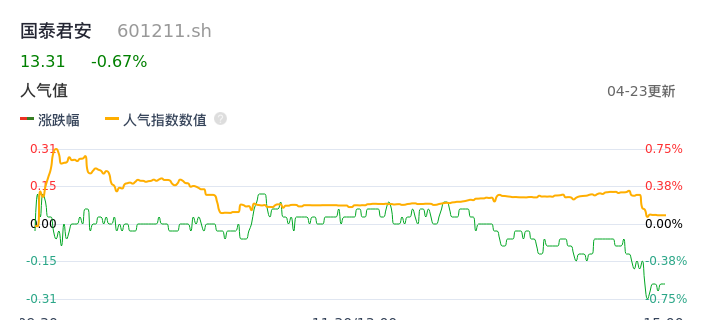 04月23日,国泰君安收报13.31,股价涨幅-0.67%,成交金额2.69亿元,换手率0.27%。