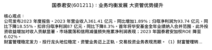值得注意的是:2024年04月广发证券的陈福分析师,首次发布关于国泰君安的研究报告,标题为:国泰君安(601211):业务均衡发展 大资管优势提升。