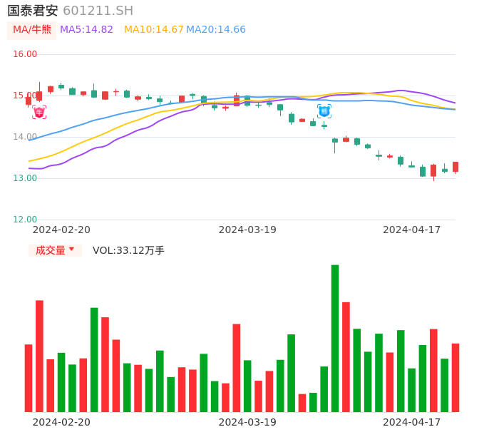 04月17日,国泰君安收报13.39,股价涨幅1.75%,成交金额4.39亿元,换手率0.44%。