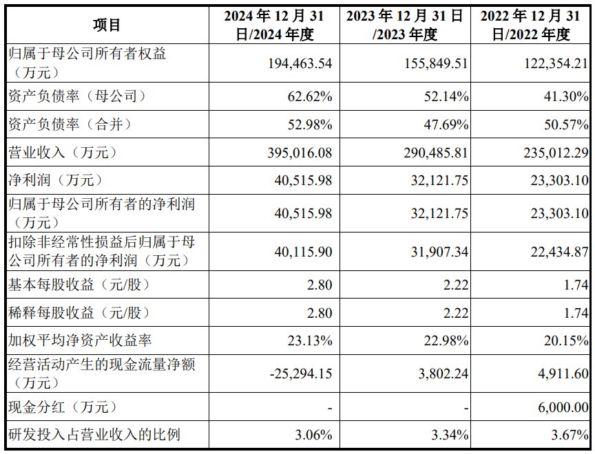 财务方面,于2022年度、2023年度、2024年度,公司实现营业收入分别约为23.5亿元、29.05亿元、39.5亿元,同期实现净利润分别约为2.33亿元、3.21亿元、4.05亿元人民币。